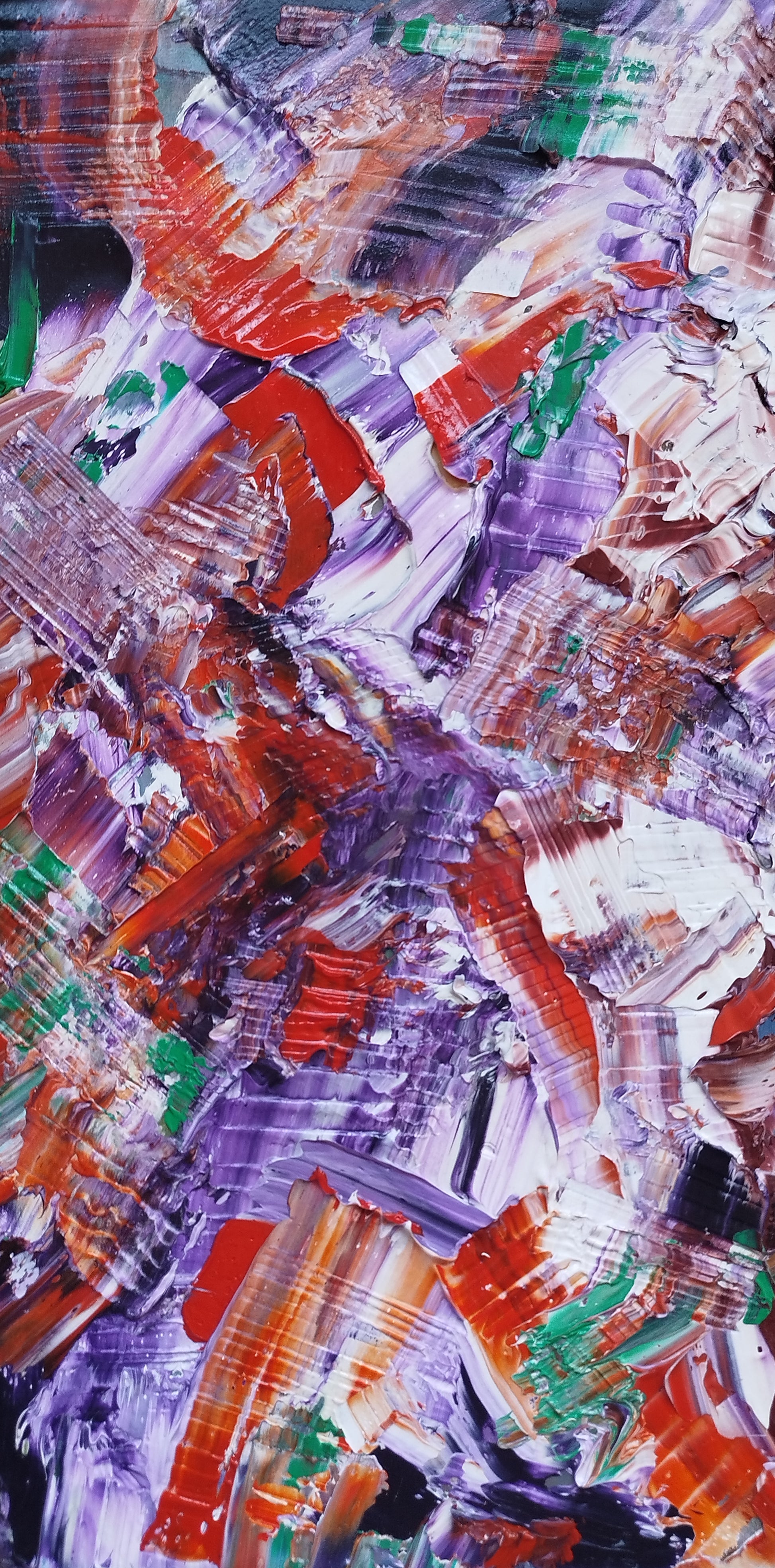 Peinture abstraite, travail au couteau | tranches du châssis peintes dans la continuité du tableau.
